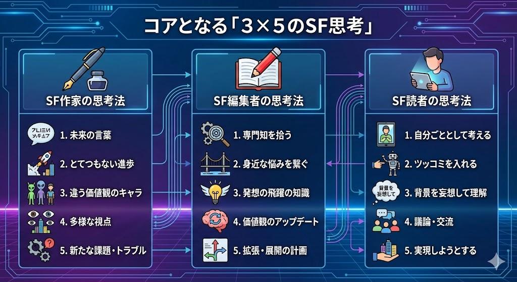 - 3つの視点: 作家(発想)、編集者(洗練)、読者(共感)の視点を掛け合わせる「3×5のSF思考」が基本。
